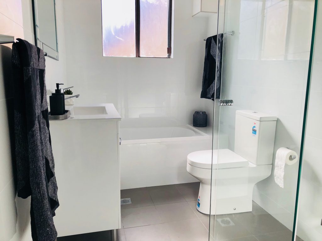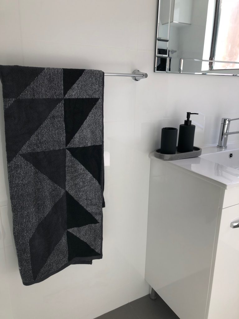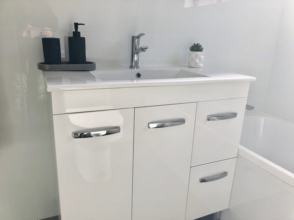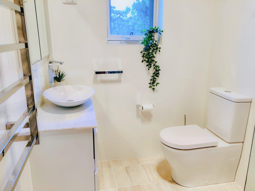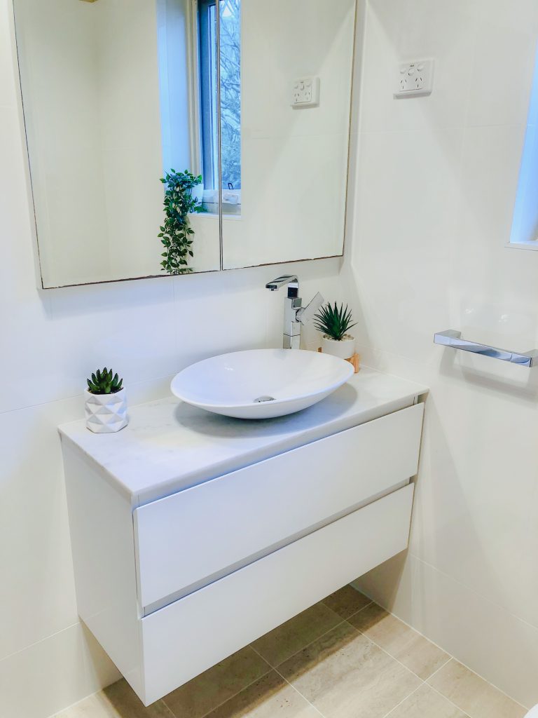 Beautiful fresh update to this bathroom using a clean neutral palette. An elegant design with one of our favourites, sandstone look tiles.