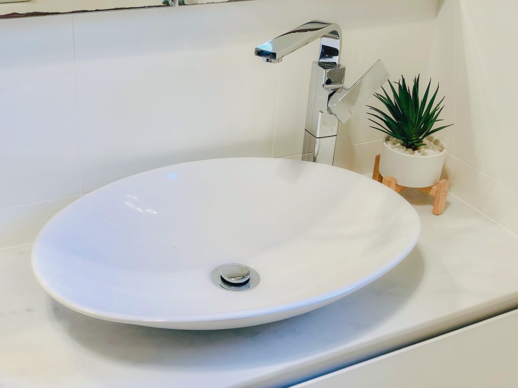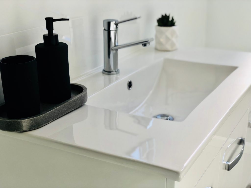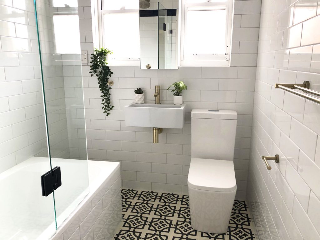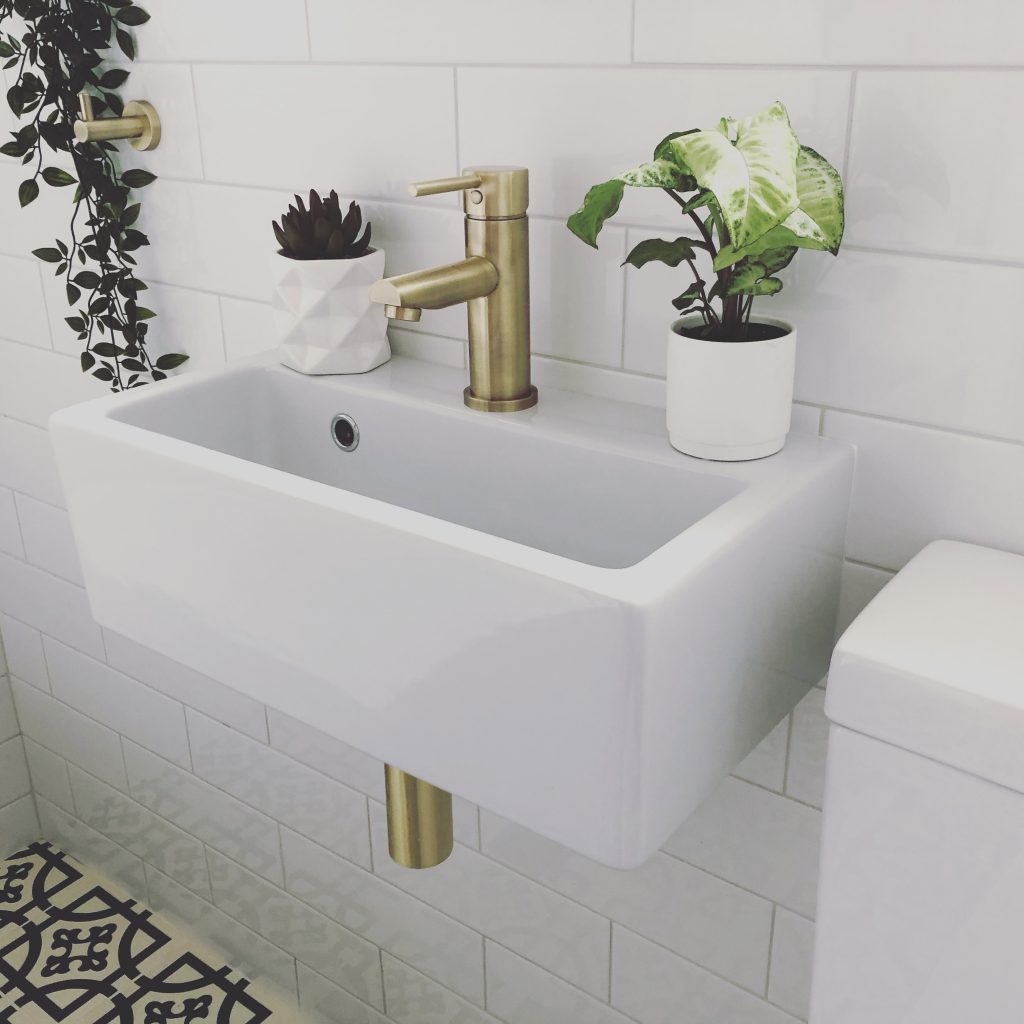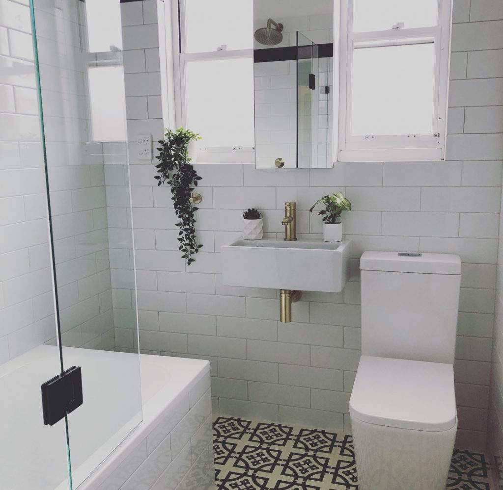 The pattern tiles and contrasting white walls creating a perfect backdrop for the gold tap ware to shine.